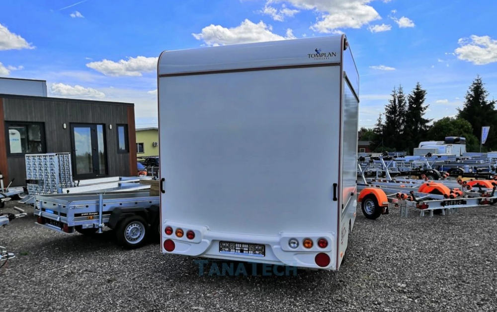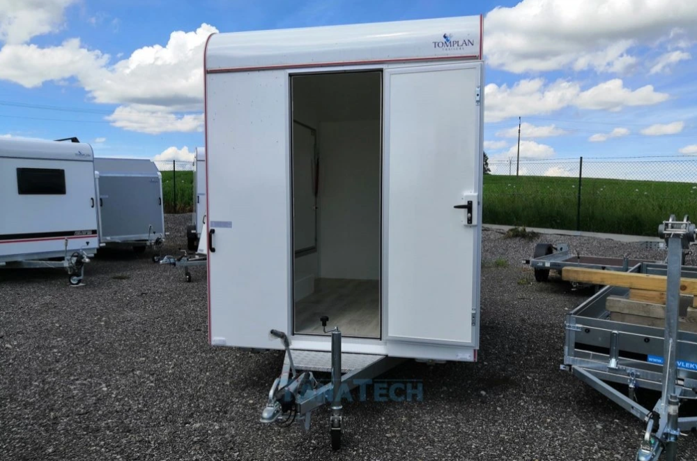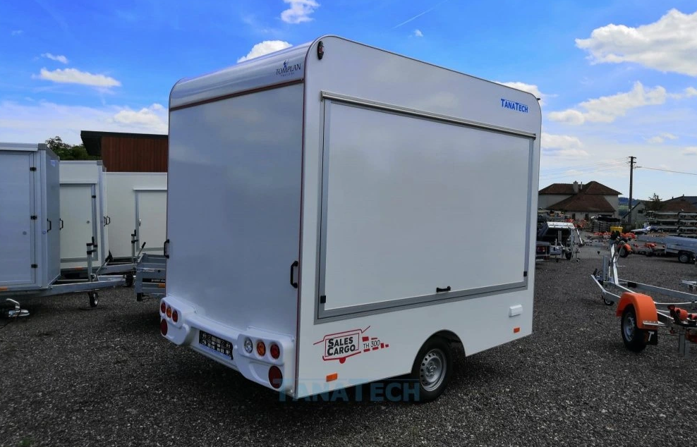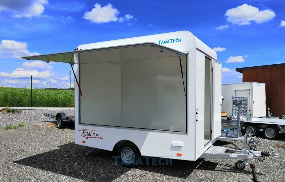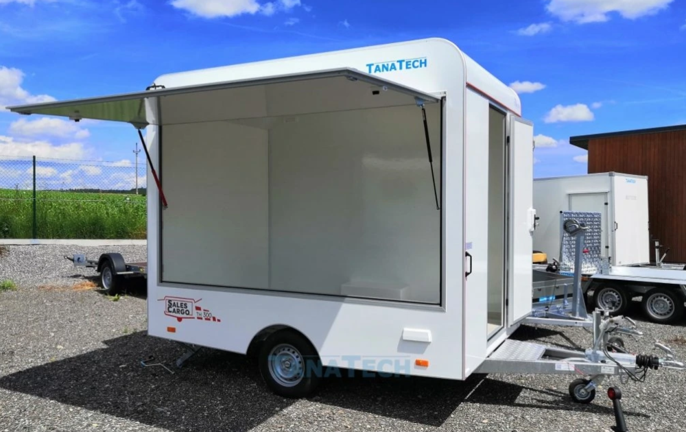 Príves vybavený ako predajný stánok - vstupné dvere, bočný výklop, oporné nohy.